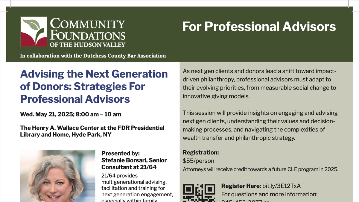 Join the Community Foundations of the Hudson Valley, in collaboration with the Dutchess County Bar Association, for a presentation on how professional advisors can adapt their evolving priorities from measurable social change to innovative giving models as next-generation clients and donors lead a shift toward impact-driven philanthropy.
